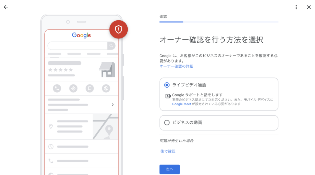 なんと、最近厳格化されているGoogleビジネスプロフィールのオーナー認証に、ライブビデオ通話が新しく実装されました。(2026年3月3日現在)